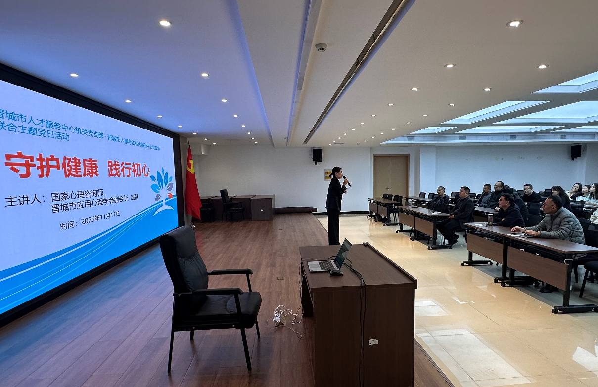 为进一步关爱中心全体工作人员身心健康,11月17日,晋城市人才服务中心机关党支部与晋城市人事考试综合服务中心党支部以“守护健康、践行初心”为主题,联合开展了健康讲座主题党日活动,讲座由晋城市应用心理学会副会长赵静为大家授课,全体工作人员参加此次活动。